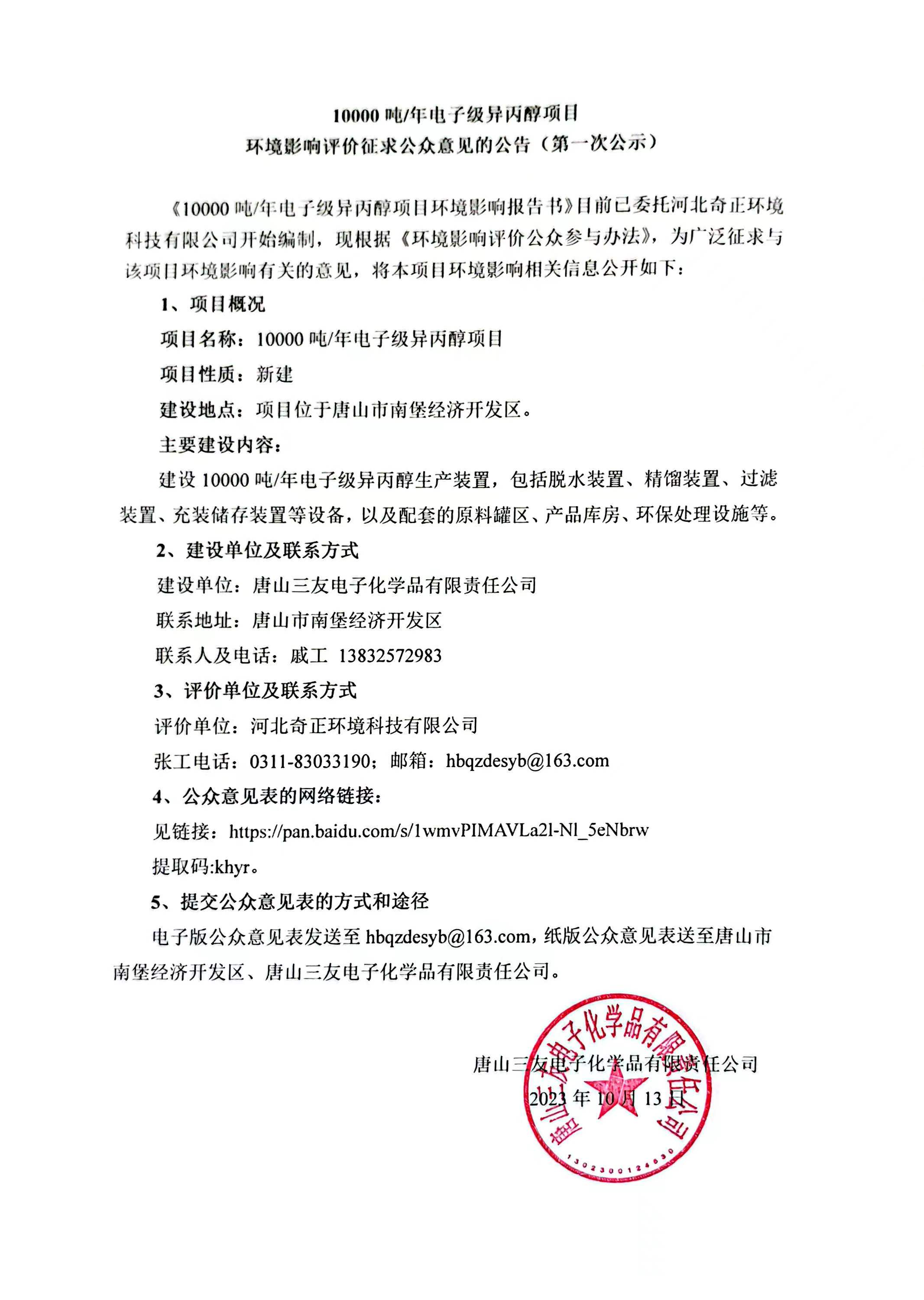 10000吨/年电子级异丙醇项目环境影响评价征求公众意见的公告(第一次公示)